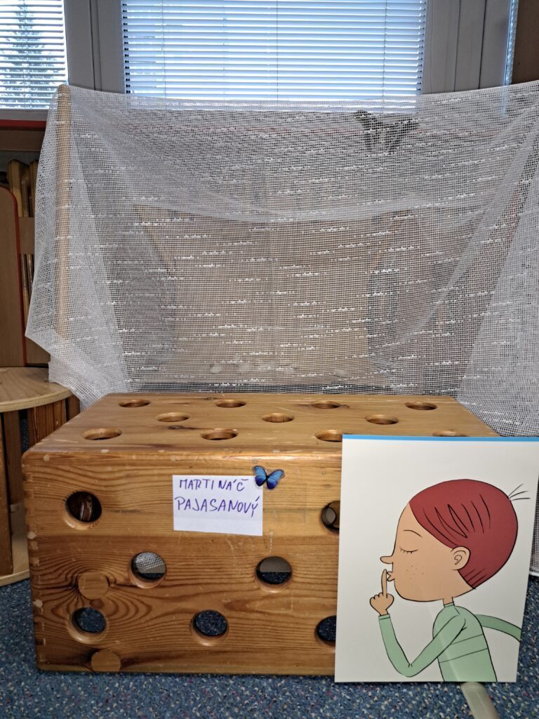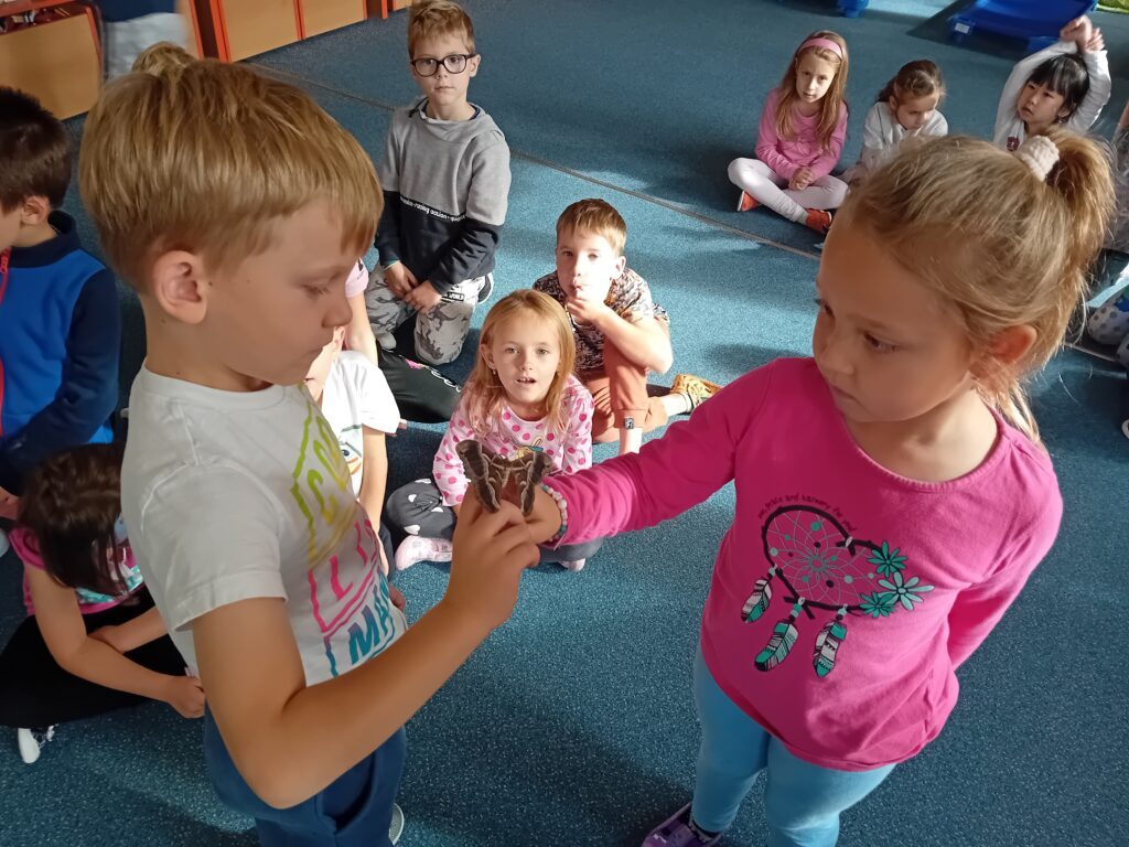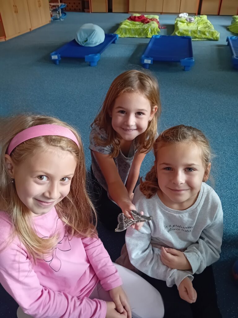 Ve Fialové třídy jsme si užili nové kamarády. Dostali jsme housenky. O housenky jsme se hezky starali, při vycházce jsme jim vždy natrhali čerstvé listy šeříku, na kterém si moc pochutnaly. Po dobrém najedení a nabrání energie se housenky zakuklily. A my každý den čekali, kdy se nám vylíhnou motýlci. Najednou už tam jeden motýl byl a každý den přibyl další. S dětmi jsme si vysvětlili, jak je důležité dodržovat pravidla tichého hlasu a klidné chůze, abychom si motýly nevyplašili a nepolekali. Jemnost svých rukou si děti vyzkoušely, když si motýlky vzaly na ruku. Údělem našich motýlů bylo naklást vajíčka, teď už nám slouží jako exempláře na pozorování. Byl to opravdu krásný zážitek mít ve třídě tento krásný hmyz a pozorovat jeho vývoj. A teď budeme čekat, zda se nám z vajíček vylíhnout housenky. To bude překvapení.