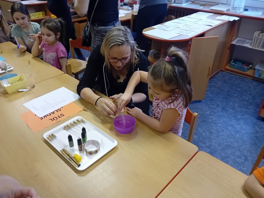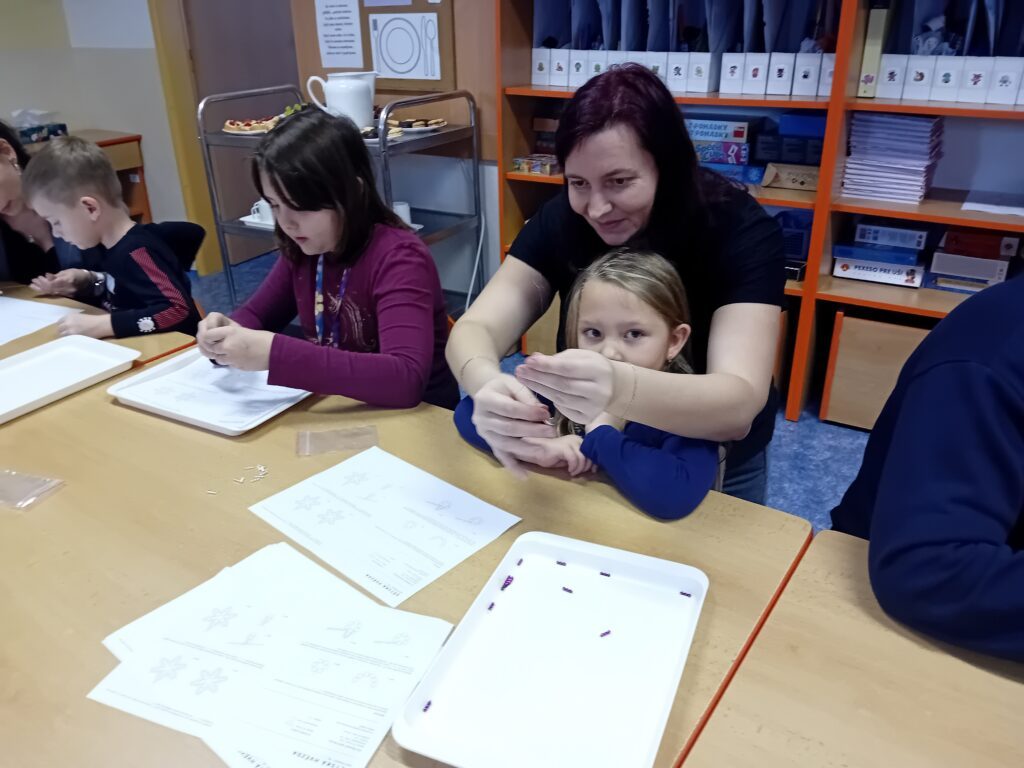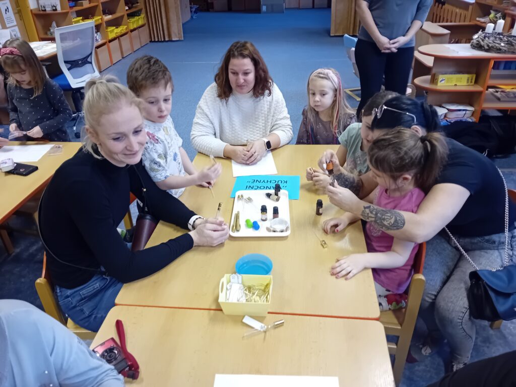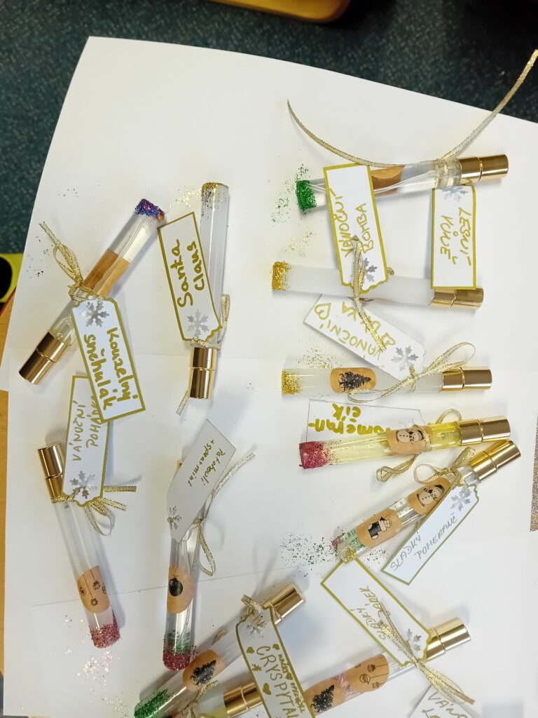 Ve čtvrtek 11. 12. proběhla ve Fialové třídě vánoční dílnička, která se nesla v duchu vánočních vůní a ozdob. Děti si na dílničku přivedly rodiče, prarodiče či sourozence a všichni společně prožili odpoledne kreativním tvořením. Vyráběli si vánoční parfémy z éterických olejů a vybírali si vůně dle svých preferencí. Každý pak své vůni vymyslel originální název. Další aktivitou byla výroba vánoční ozdoby ve tvaru hvězdy ze skleněných korálků od firmy Rautis. Na dílničce vládla krásná vánoční atmosféra doprovázená koledami. Tvoření mělo úspěch a všichni si vánoční odpoledne moc užili.