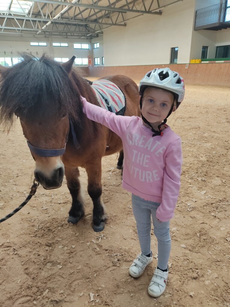 Moc hodné paní nás provedly celou farmou, viděly jsme koně, poníky, pávy, slepičky a mohly jsme si vyzkoušet, jak se sedí na koňských kočárech. Největší zážitek byl ježdění na ponících. Každý si mohl objet celou jízdárnu a nakonec poníkům dát mlsku – mrkvičku.