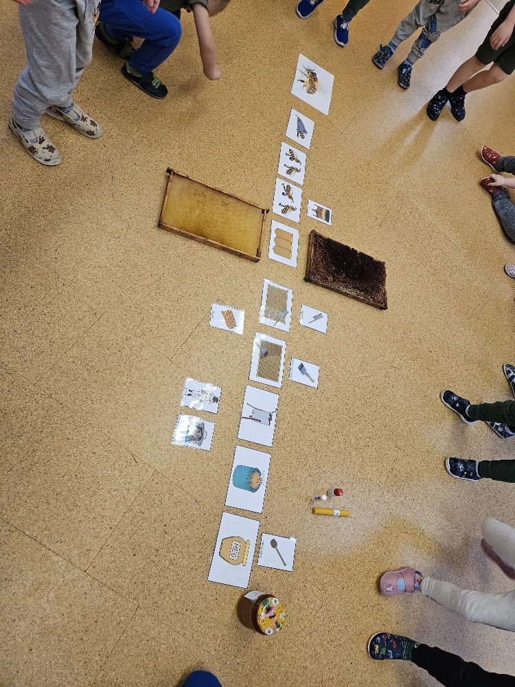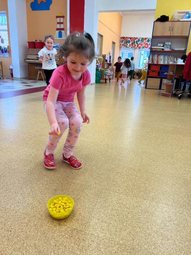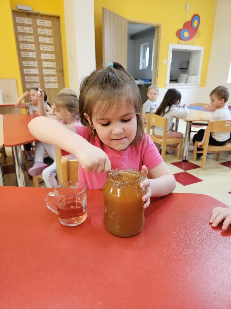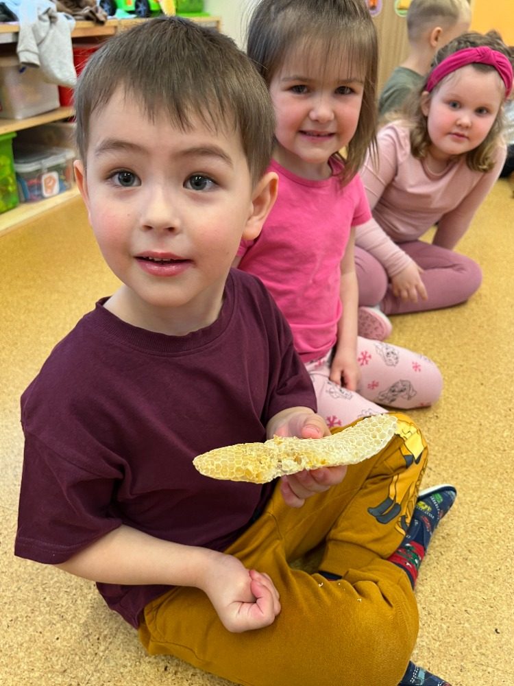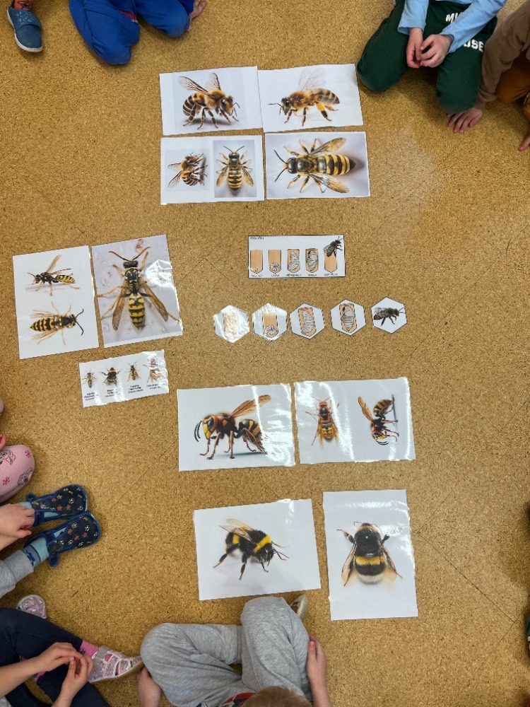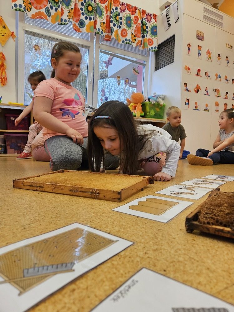 Děti z Červené třídy uzavřely měsíc březen tématem „Hmyz“. Mezi lidmi se říká „otravný hmyz“, ale ve skutečnosti jsou to velmi užitečná a obdivuhodná zvířata. Výuka byla zaměřena převážně na včely. Nejprve jsme se snažily dětem přiblížit život včely. Popsaly jsme, jak taková včela vypadá a jak se liší od vosy, sršně a čmeláka (vzhledově i chováním). Pak se z dětí staly včeličky a na vlastní kůži si vyzkoušely, jak náročnou práci vykonávají. Jedna skupina nosila „nektar“ po jedné kuličce do „úlu“ – včeličky se velmi nalétaly. Druhá skupina nasávala sosáčkem „nektar“ a přenášela do „úlu“. Pak jsme si vysvětlili krok po kroku, jak vzniká med (včetně reálných předmětů a obrazového materiálu) a nakonec ho děti měly možnost ochutnat. Nejprve se napily ovocného čaje neslazeného. Poté si každý nabral na lžičku med, ochutnal a osladil jím čaj. Věříme, že si děti o včeličkách zapamatovaly mnoho informací.